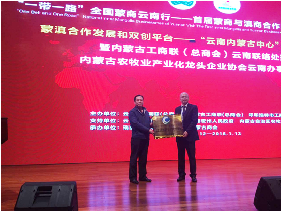 論壇上,蒙滇合作發(fā)展和雙創(chuàng)平臺——“云南內(nèi)蒙古中心”建設(shè)啟動儀式暨內(nèi)蒙古工商聯(lián)(總商會)云南聯(lián)絡(luò)處授牌、內(nèi)蒙古農(nóng)牧業(yè)產(chǎn)業(yè)化龍頭企業(yè)協(xié)會云南辦事處授牌儀式同期舉行。內(nèi)蒙古農(nóng)牧業(yè)廳黨組成員、總農(nóng)藝師王雨峰授予云南省內(nèi)蒙古商會“內(nèi)蒙古農(nóng)牧業(yè)產(chǎn)業(yè)化龍頭企業(yè)協(xié)會云南辦事處”的牌匾,內(nèi)蒙古農(nóng)牧業(yè)產(chǎn)業(yè)化龍頭企業(yè)協(xié)會執(zhí)行會長林永亮宣讀辦事處成立文件,由云南省內(nèi)蒙古商會會長徐國林擔任辦事處主任。