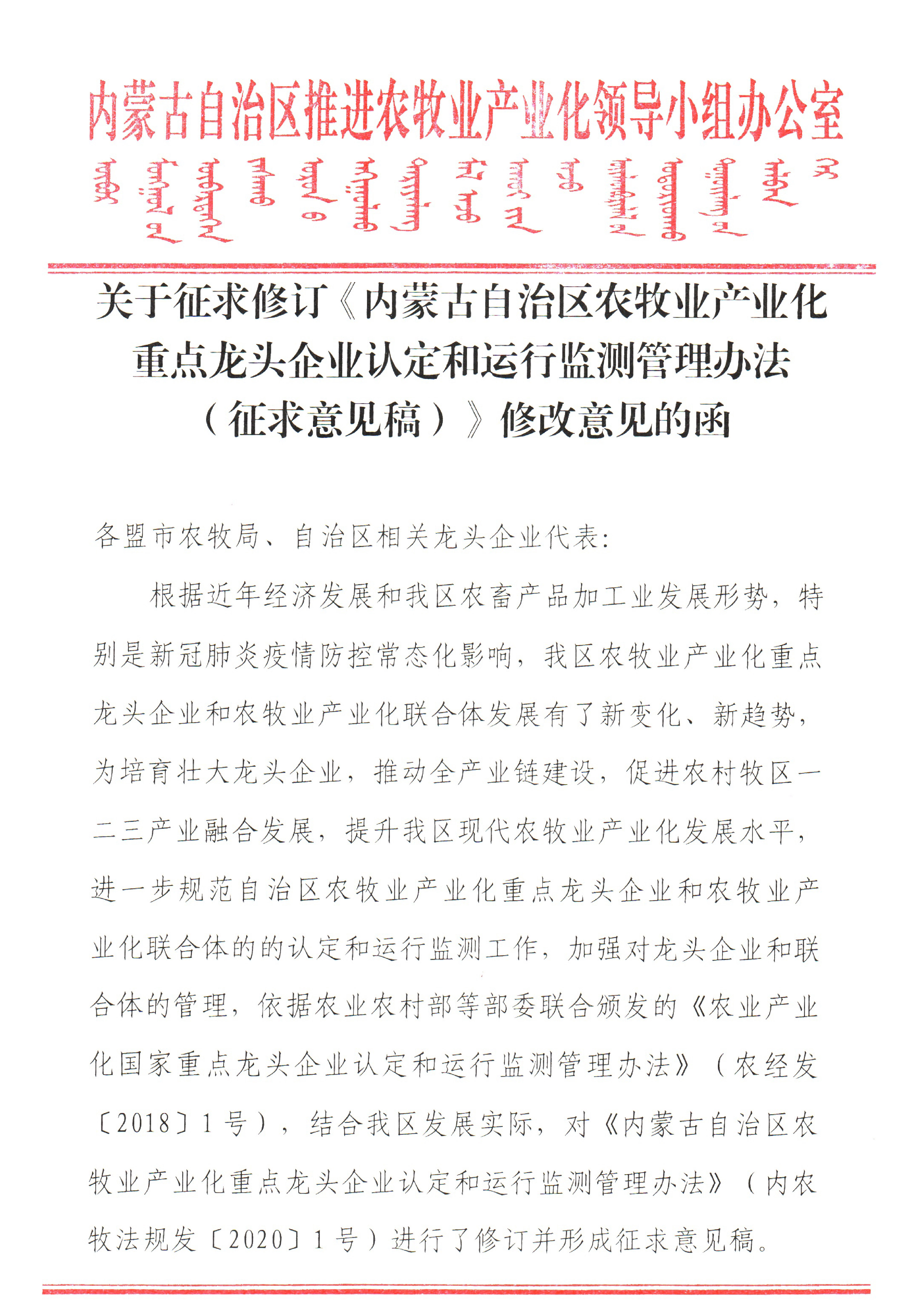 標(biāo)題:關(guān)于征求修訂《內(nèi)蒙古自治區(qū)農(nóng)牧業(yè)產(chǎn)業(yè)化重點龍頭企業(yè)認(rèn)定和運(yùn)行監(jiān)測管理辦法(征求意見稿)》修改意見的函