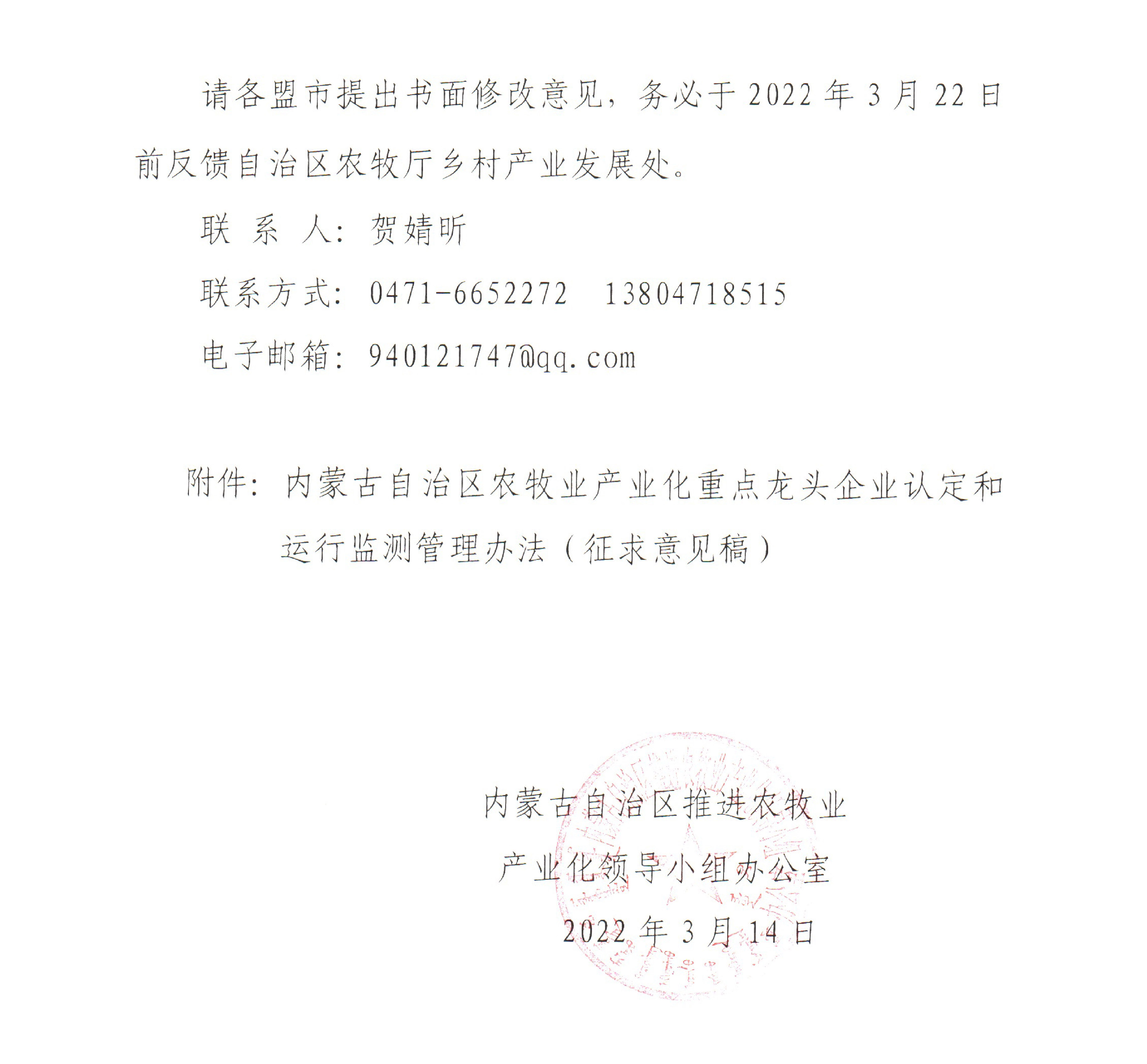 附件:關(guān)于征求修訂《內(nèi)蒙古自治區(qū)農(nóng)牧業(yè)產(chǎn)業(yè)化重點龍頭企業(yè)認(rèn)定和運(yùn)行監(jiān)測管理辦法(征求意見稿)》修改意見的函