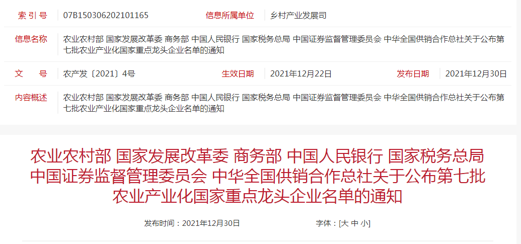 企業(yè)名稱:農(nóng)業(yè)農(nóng)村部 國家發(fā)展改革委 商務(wù)部 中國人民銀行 國家稅務(wù)總局 中國證券監(jiān)督管理委員會(huì) 中華全國供銷合作總社關(guān)于公布第七批農(nóng)業(yè)產(chǎn)業(yè)化國家重點(diǎn)龍頭企業(yè)名單的通知