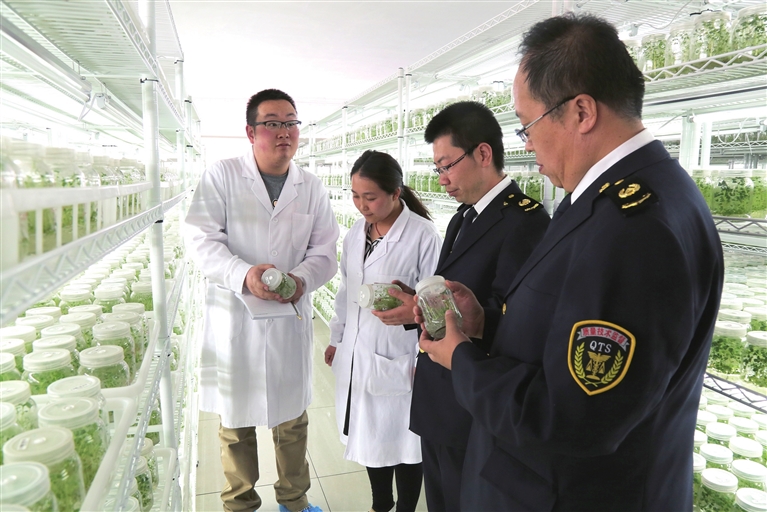 質(zhì)監(jiān)工作人員來到烏蘭察布市民豐種業(yè)公司,了解標準化育苗情況。