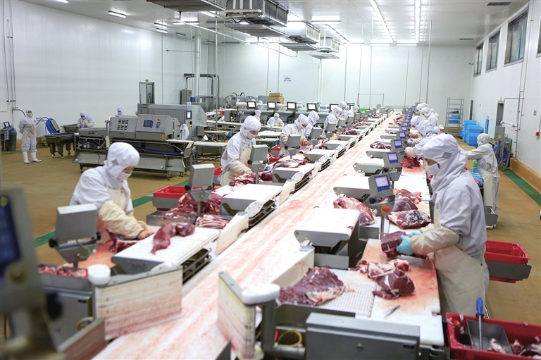 內(nèi)蒙古科爾沁牛業(yè)股份有限公司嚴格按照歐盟食品衛(wèi)生標準建立了牛肉加工生產(chǎn)流水線,形成了年屠宰 20萬頭肉牛,生產(chǎn)冷鮮、冷凍肉4萬噸的規(guī)模。該公司產(chǎn)業(yè)鏈模式建設(shè)有效帶動了周邊農(nóng)牧民增產(chǎn)、增收。